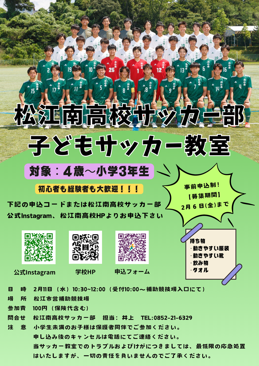 子どもサッカー教室開催!!! サッカー部 2026.01.08 こんにちは!サッカー部です! 夏ぶりに子どもサッカー教室を開催します!今回は4歳~小学3年生が対象です。初心者も経験者も大歓迎です! たくさんの子どもたちと一緒にサッカーができることを楽しみにしています。ぜひご参加ください! 申込はこちらから→申込フォーム 日時:2026年2月11日(水) 10:30~12:00(10:00~受付) 場所:松江市営補助競技場 費用:100円(保険料含む) 問合せ:松江南高校サッカー部 担当井上 TEL:0852-21-6329