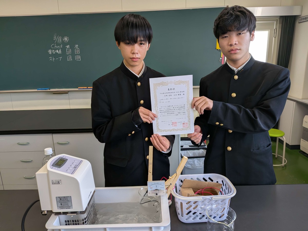 発表賞を受賞しました(科学部) 科学部 2026.03.13 2026年1月10日(土)に島根大学で行われました「汽水域合同研究発表会2026」の発表賞が本校科学部の発表した生徒に送られてきました。参加した生徒達は、中学生が中海の研究発表していて驚いたこと、まだまだ自分たちは研究が未熟である点など感じて、更に意欲を高めたようでした。