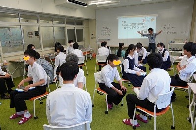 本校生の他に県内他校からも2校11名に参加していただき、計19名で互いに行ってきた探究活動を振り返り、今後にどう活かしていくかを考え、発信していきました。