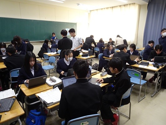 【第2学年 普通科】探究活動の様子(RAP応用A) 授業 2026.01.21 「分野別成果発表会」に向けて発表スライドを作成しました。 今回は「結果」・「考察」・「展望」のスライドも加えました。 どの班も協力して意見を出し合いながら作業を進めていました!