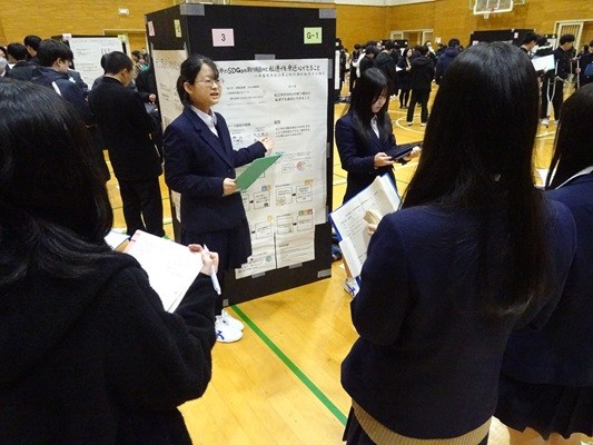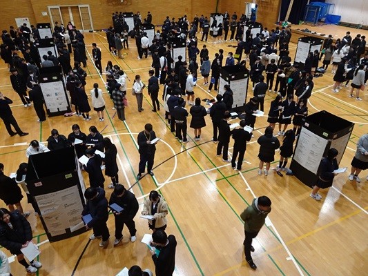 【第1学年】ミニ探究成果報告会(RAP基礎A・B) SSH 2026.02.04 2学期から3学期にかけて、RAP基礎の授業では、1年生普通科と探究科学科がフィールドワーク先で学んだことを基に、 普通科は社会問題に関する探究を進め、探究科学科は4つの科学分野から探究を進めてきました。 その探究の成果を先日、パネルディスカッションの形式で発表しました。 当日はフィールドワークでお世話になった企業の方にもお越しいただき、多くのアドバイス等をいただきました。 生徒たちは自身の探究の成果を自信をもって伝えることができていました。