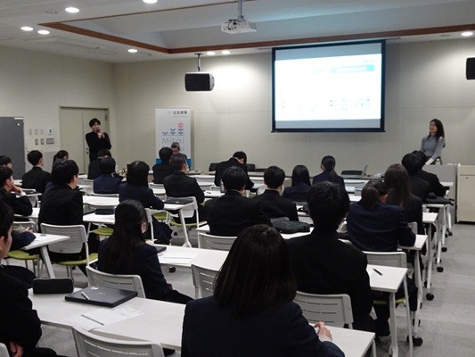 当日は、住友商事様で働いておられる社員2名の方を講師としてお招きし、人生グラフを示しながら、高校生・大学生時代の経験や、現在携わっている仕事の内容についてお話いただきました。また、学校での学びや活動と実社会での仕事とのつながり、変化の厳しい時代において求められる能力やスキルについても、具体的にお話しいただきました。